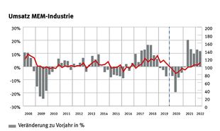 Das auftragsvolumen der Schweizer MEM-Industrie liegt nach sechs Quartalen mit positiven Wachstumsraten nun 30 Prozent über dem Vorkrisenniveau im vierten Quartal 2019. Die Wachstumsdynamik hat jedoch im zweiten Quartal 2022 abgenommen. Ein ähnliches Bild zeigt sich bei den Umsätzen. Die stiegen gegenüber dem ersten Halbjahr 2021 um 12,1 Prozent. Aufgrund des hohen Auftragsbestandes dürften die Umsätze auch im zweiten Halbjahr weiter zulegen. Sowohl KMU wie auch Grossfirmen profitieren von dieser positiven Geschäftsentwicklung.