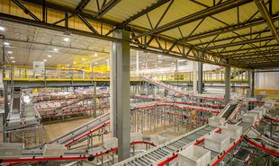 Die Auftragsbehälter werden entweder direkt in den Versand transportiert oder in einem Shuttle-Puffer zwischengelagert. Bestellungen werden in Kartons kommissioniert, verschlossen und etikettiert. Das Zusammenstellen der Paletten für den Versand an B2B-Kunden übernehmen drei TGW SlotStax-Palettierer. Um die Steuerung des Warenflusses und der komplexen Prozesse kümmert sich die TGW Warehouse Software.