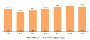 Die deutsche Intralogistik-Branche hatte in 2024 Auftragsrückgänge von 9 Prozent zu verkraften, verzeichnete aber laut VDMA immer noch ein Produktionsvolumen von 27,7 Mrd. Euro. Für 2025 rechnet der Fachverband mit einem Rückgang des Produktionsvolumens von 2 Prozent auf 27,2 Mrd. Euro.